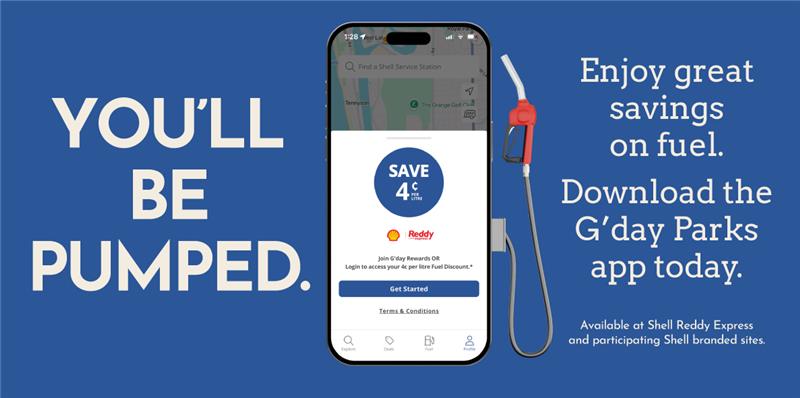 Fuel discount offer rates are subject to change at Viva Energy's (Shell licensee) discretion with prior notice from time to time. The applicable fuel discount offer rate will be set out in the G'day Parks app and any changes will be provided through an email to your registered email address.